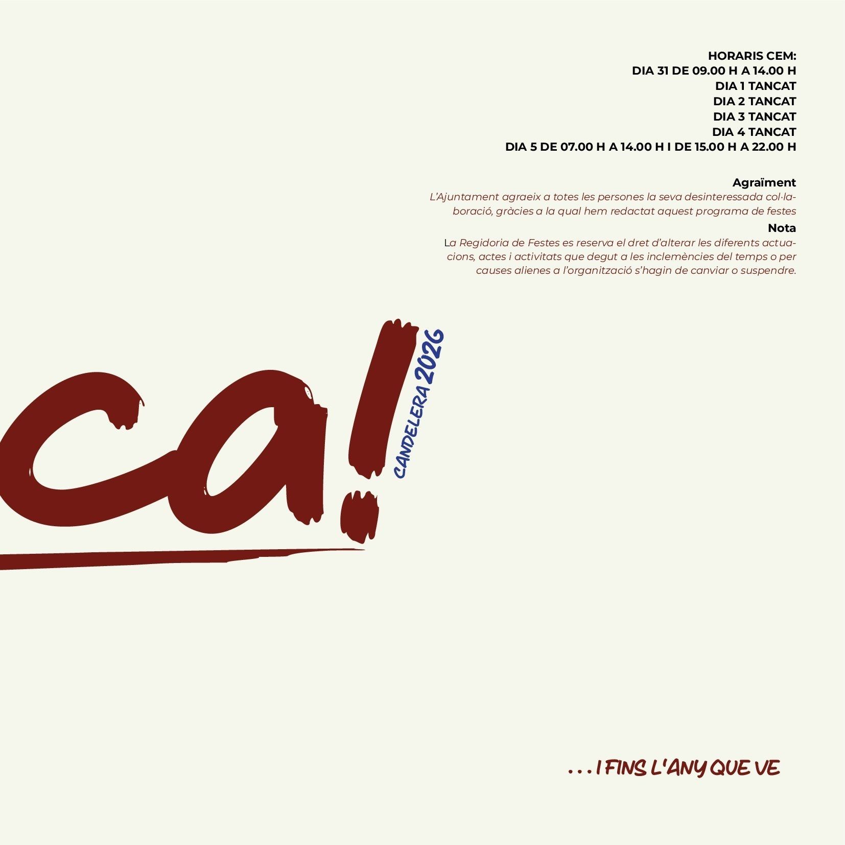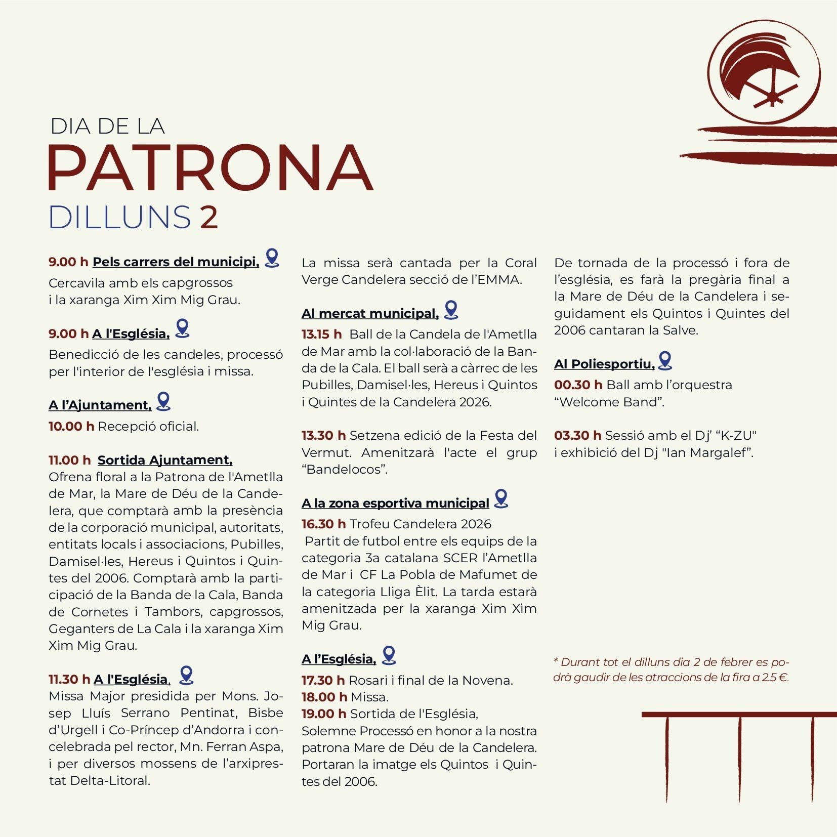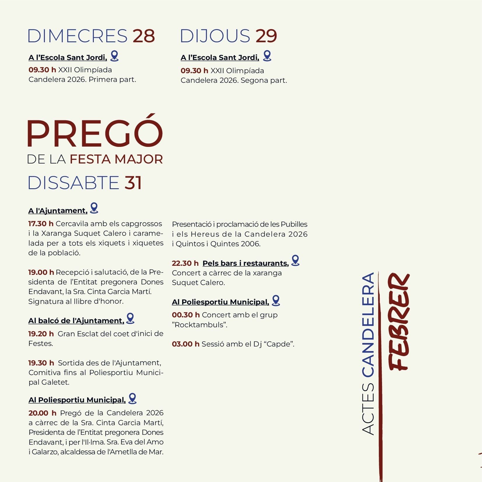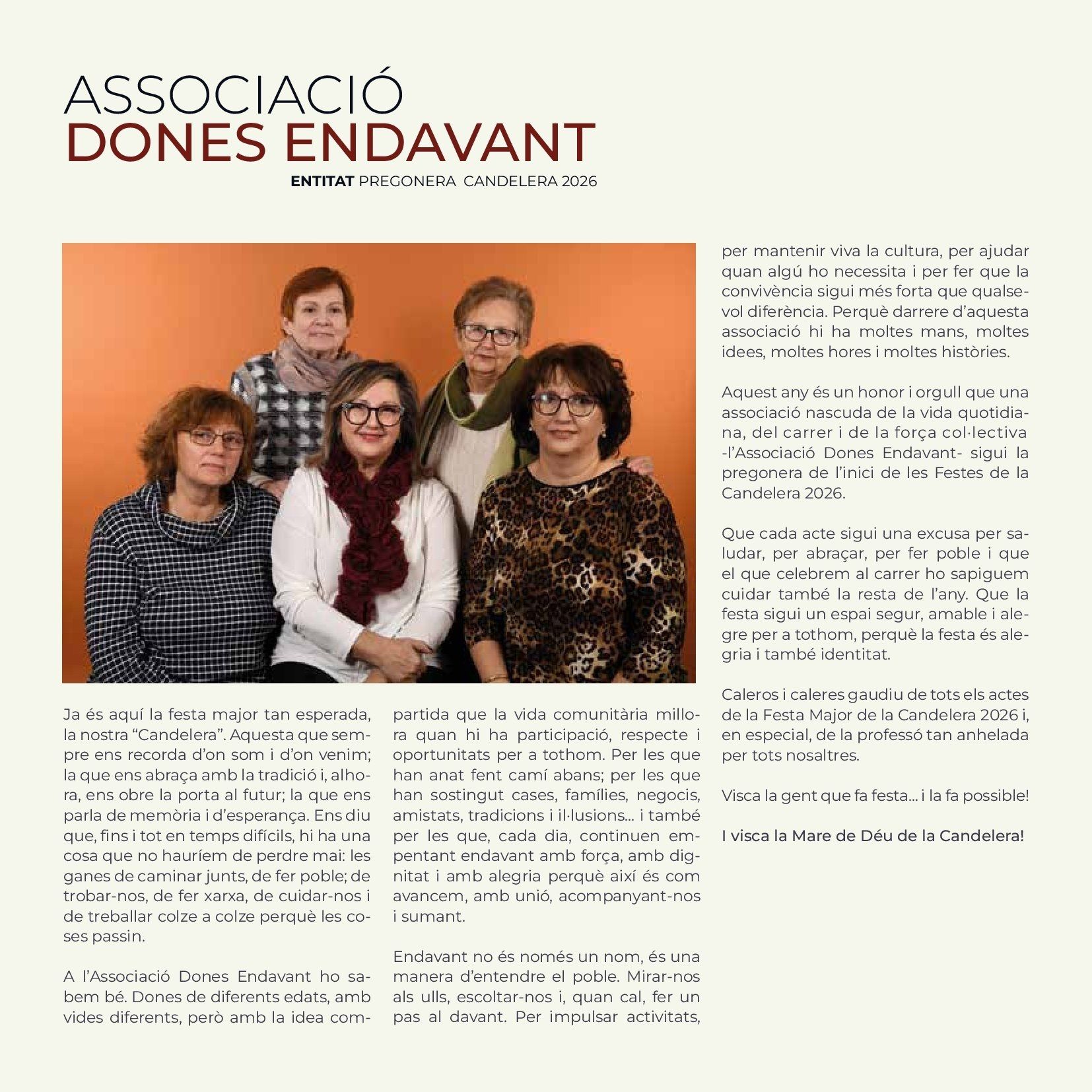 The Candelera, Carnivals Ametlla de Mar As elsewhere in Catalonia, Ametlla de Mar celebrates February 2nd, Festival of Candlemas, and as in all similar celebrations, the primary motivation is religious devotion to the patron saint, the Virgin of the Candlemas . Although today the religious sense of the party has been reduced, it’s true that Ametlla de Mar has a particular devotion to the patron, which gives meaning to the procession in his honour which is held the evening of February 2 where caleros pay homage through the main streets of the village with a candle (atxa) held in the hand. The solemnity of the procession, which peaks when it arrives at the port, is traditionally marked by the presence of many curious visitors and people from nearby counties and other parts of Catalonia. Traditions evolve but the meaning is the same. This same has happened with the young men and women responsible for carrying Candelera during the procession. Until the 80s, the responsibility was limited to young men who had completed military service during the year. Currently its is divided between the "quintos", boys and girls who during the year turned 20, and that apart from carrying the Mary they become, along with the "heiresses", the stars of the fiesta. But the tradition of The Candelera is not limited to the religious sentiment, but unfolds in any of the areas of the Calera society, with cuisine being one of the most important parts, with native sweets, the "pastissets" and the "corassons" an accompaniment to any well prepared table. Popular culture is represented throughout the celebrations with music from brass bands and the esteemed presence of Nanos, which are popular imaginary characters brought to life. Giants rome the streets such as Sant George and the Dragon, along with Pere and La Candelera, a couple of giants with the name of the local patron saints, leading the parade, although most popular part is the floral offering to the patron, also on February 2nd. Women's Day, where the women rule the village, and the day of the senior people (older people), in which retirees share a fellowship meal, are other traditions that have been introduced in the last 30 years and have become firmly established among the "caleros and caleras." Music festivals, public drinks parties, sports activities and exhibitions come together during the festival in which the afternoons come alive with one the oldest traditions, dancing in the square and the raffle for the last