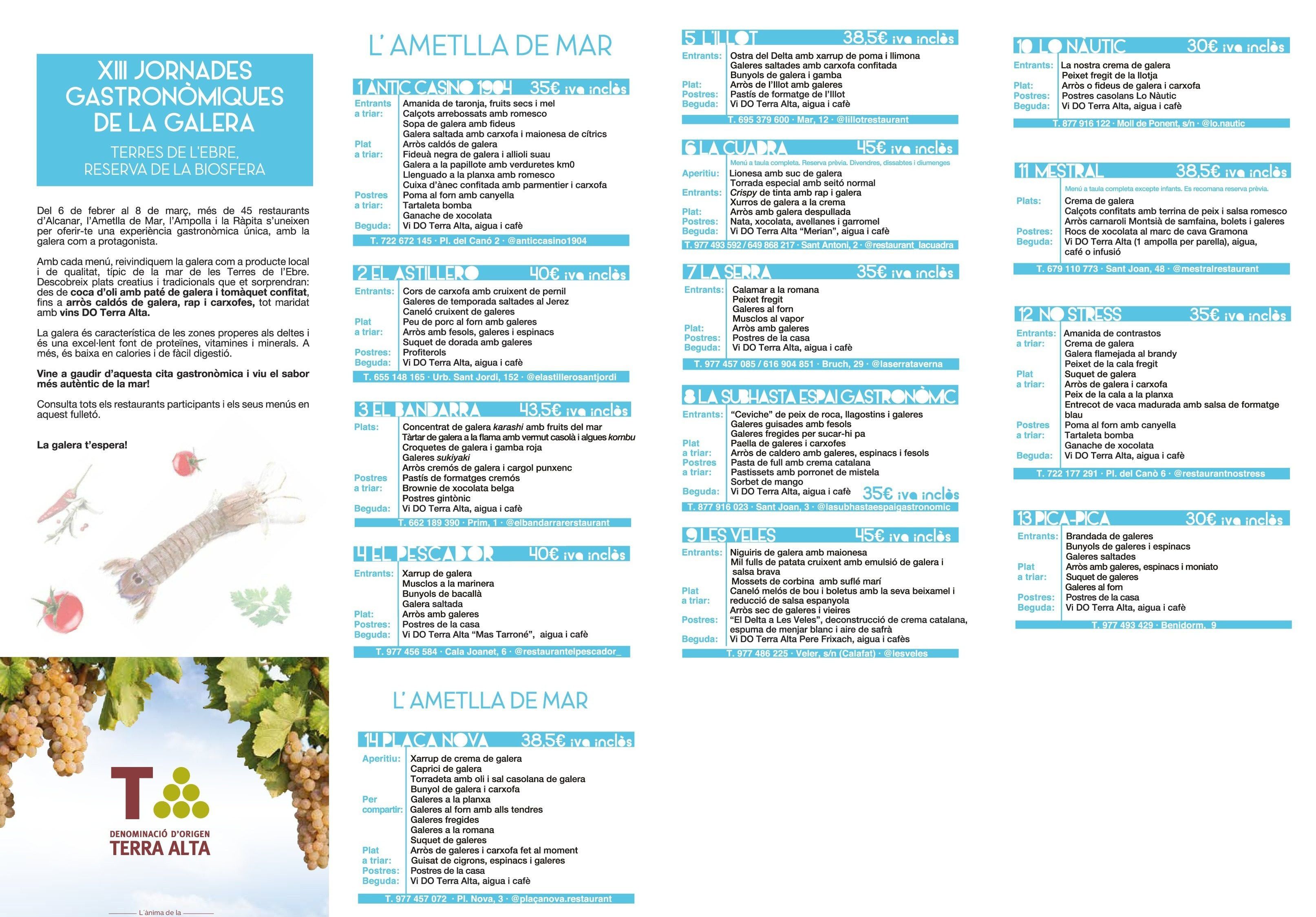 Alcanar, l’Ametlla de Mar, l’Ampolla and Sant Carles de la Ràpita. The four fishing towns come together to offer exquisite gastronomy menus in their restaurants, and the main feature is the galera (a type of crustation), a local product with the quality typical of the Ebro sea. This crustacean, abundant in waters close to the delta which are rich in nutrients, is an excellent source of high quality protein, vitamins and minerals. Unlike other crustaceans, the galera is low in calories and easy to digest. Its flesh is fine and tasty, which facilitates preparation. From February 6 to March 8 Come and taste the galera in Terres de l'Ebre. Restaurants in Alcanar, Ametlla de Mar, Ampolla and Sant Carles de la Rapita have prepared a series of menus where you can taste delicious galera ravioli with seasonal mushroom sauce, galera and artichokes with garlic or galera pudding with mushrooms and white truffles, all accompanied by local wines such as Grenache, DO Terra Alta.