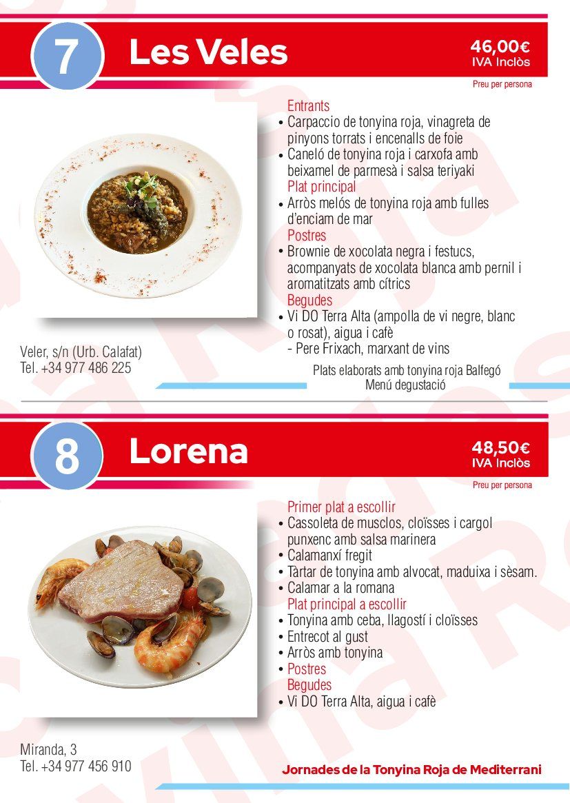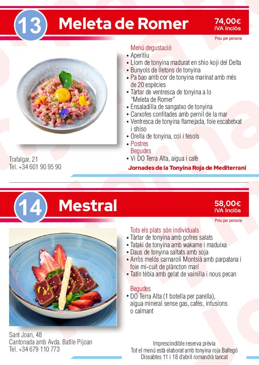 Las Jornadas Gastronómicas de l’Ametlla de Mar son el escaparate de los productos de su lonja y una muestra de las mejores recetas de sus restauradores. El protagonista es el atún rojo y nuestros cocineros, que con sus técnicas tanto tradicionales como innovadoras, nos deleitarán con los diferentes menús que ofrecen durante las jornadas gastronómicas. En las jornadas gastronómicas del Atún Rojo, con el fin de celebrar, dar a conocer y disfrutar del atún rojo del Mediterráneo, presentamos un programa que, dirigido a profesionales y al público en general (desde aficionados a familias), convierte l’Ametlla de Mar en una gran fiesta donde todos, desde los mayores hasta lo más pequeños, podrán vivir el singular universo del atún rojo en un entorno donde coinciden gastronomía, mar, aventura, fiesta, juegos, degustaciones, mercado de productos, carreras, menús exclusivos con el atún rojo en los mejores restaurantes de l’Ametlla de Mar… Unos días alrededor de uno de los mejores productos gastronómicos del mundo –el atún rojo- donde disfrutar del espíritu lúdico de l’Ametlla de Mar.